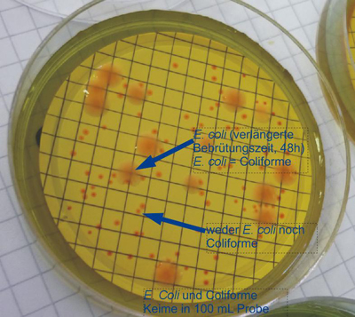 Escherichia coli sind. Somit liegt die Wahrscheinlichkeit sehr hoch, eine eventuelle Belastung des Trinkwassers durch pathogene Keime durch die Analytik von